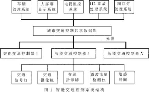 智能交通網絡結構如圖1所示。當網絡正常工作時,共享數據庫通過光纜收集控制器預處理過的圖像和數據信息,在控制中心通過相應的數學模型進行預測、誘導和控制[2~4],然后將控制參數下載到智能交通路口控制器,由它控制交通指示牌和交通信號燈,來實現整個系統的最優控制策略。當智能交通路口控制器不能跟控制中心通訊的時候,它可以根據當地檢測到的交通流量和歷史數據的數學模型進行基于該路口的局域最優控制。當發生事故和其它特殊情況時,還可以通過手動實現路口的控制。所以在智能交通中,智能交通路口控制器是一個收集數據和實現控制的平臺。它需要完成以下任務:(1)與控制中心通過光纜進行通訊;(2)執行交通控制算法;(3)接收攝像機圖像;(4)與微波檢測儀通訊;(5)與地感線圈通訊;(6)控制交通信號燈;(7)控制交通指示牌。