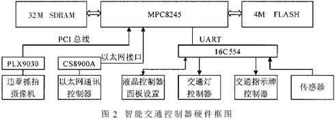 智能交通控制器硬件框圖如圖2所示,MPC8245擴展了32M SDRAM和4M FLASH存儲器,其中,4M FLASH用來存儲Linux內核和應用程序,32M的SDRAM在系統運行的時候存儲Linux的內核和應用程序。違章抓拍控制器通過PCI總線接口芯片PLX9030接入MPC8245,系統可以兼容各種不同的違章抓拍控制器,通過編寫不同的驅動程序來實現。以太網控制器通過以太網接口芯片 CS8900A接入MPC8245,可以接入Internet,加入光線接口就可以實現光纖通訊。通過MPC8245的UART口擴展了一片 16C554,擴展出了四個串口,分別接入液晶控制器、交通燈控制器、交通指示牌控制器和傳感器。液晶控制器用來設定或者修改智能路口控制器控制參數,而且還可以通過手動直接控制交通燈。交通燈的控制是直接控制交通燈,接收來自MPC8245的參數設定,比如路口數、紅綠燈時間等,并控制交通燈。交通指示牌是用來提供交通信息的大屏幕,MPC8245接收來自控制中心的交通信息,并將這些信息送到交通指示牌控制器,顯示在大屏幕上,用來疏導交通。檢測設備在目前交通控制中的作用越來越重要,各種檢測設備不但種類繁多,而且新產品不斷涌現,因此TCS-0602預留了包括串口在內的多種接口方式。