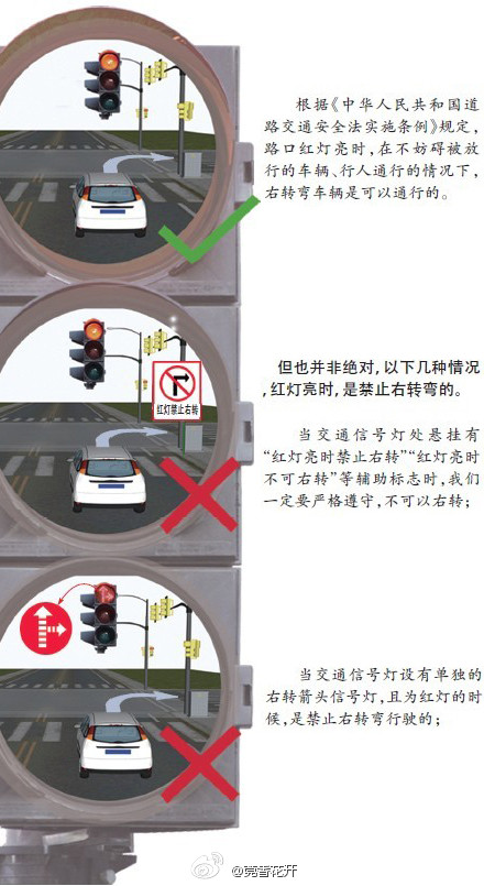 紅燈亮時,右轉彎的車輛在不妨礙被放行的車輛、行人通行的情況下,可以通行。但以下情況是禁止右轉彎的:1.當交通信號燈處懸掛有 “紅燈亮時禁止右轉”等輔助標志時,不可以右轉;2.當交通信號燈設有單獨的右轉箭頭信號燈,且為紅燈的時候,是禁止右轉彎行駛的。