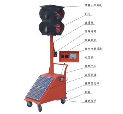 太陽能移動信號燈采用高亮度LED發光管作為發光材料,蓄電池+太陽能電池板作為電源,外形采用一體式結構,所有部件均嵌入其中,具有外形美觀,移動方便、操作簡單等特點,特別適用于臨時路口的交通控制。