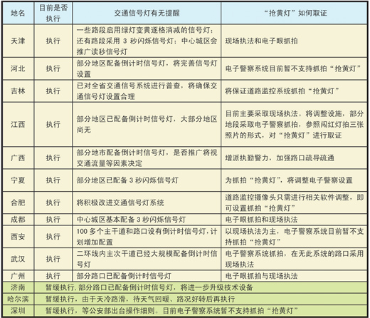根據相關省市交管部門提供的信息,大多數地方交管部門將嚴格執行對搶黃燈的處罰措施,小部分城市表示因電子警察系統暫不支持抓拍搶黃燈、等待公安部出臺操作細則、冬季冰雪路面導致路口標線模糊不清等原因將暫緩執行。