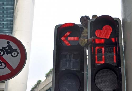 14、上海延安西路中山西路路口紅燈,2011年5月9日,位于上海延安西路中山西路路口的某個紅燈呈現愛心形狀,這個個性信號燈受到網友熱捧。9日中午,相關施工人員將蒙在紅燈上的愛心蒙版摘取下來。