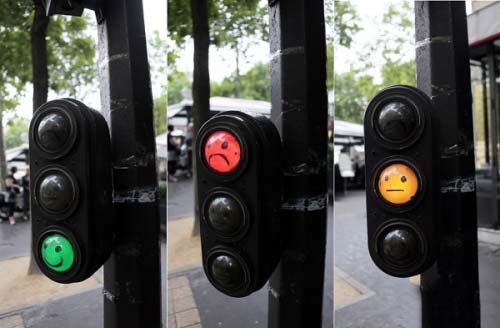 11、巴黎街頭的紅綠燈,紅燈對應的是哭臉,綠燈對應的是笑臉,黃燈對應的是無表情。